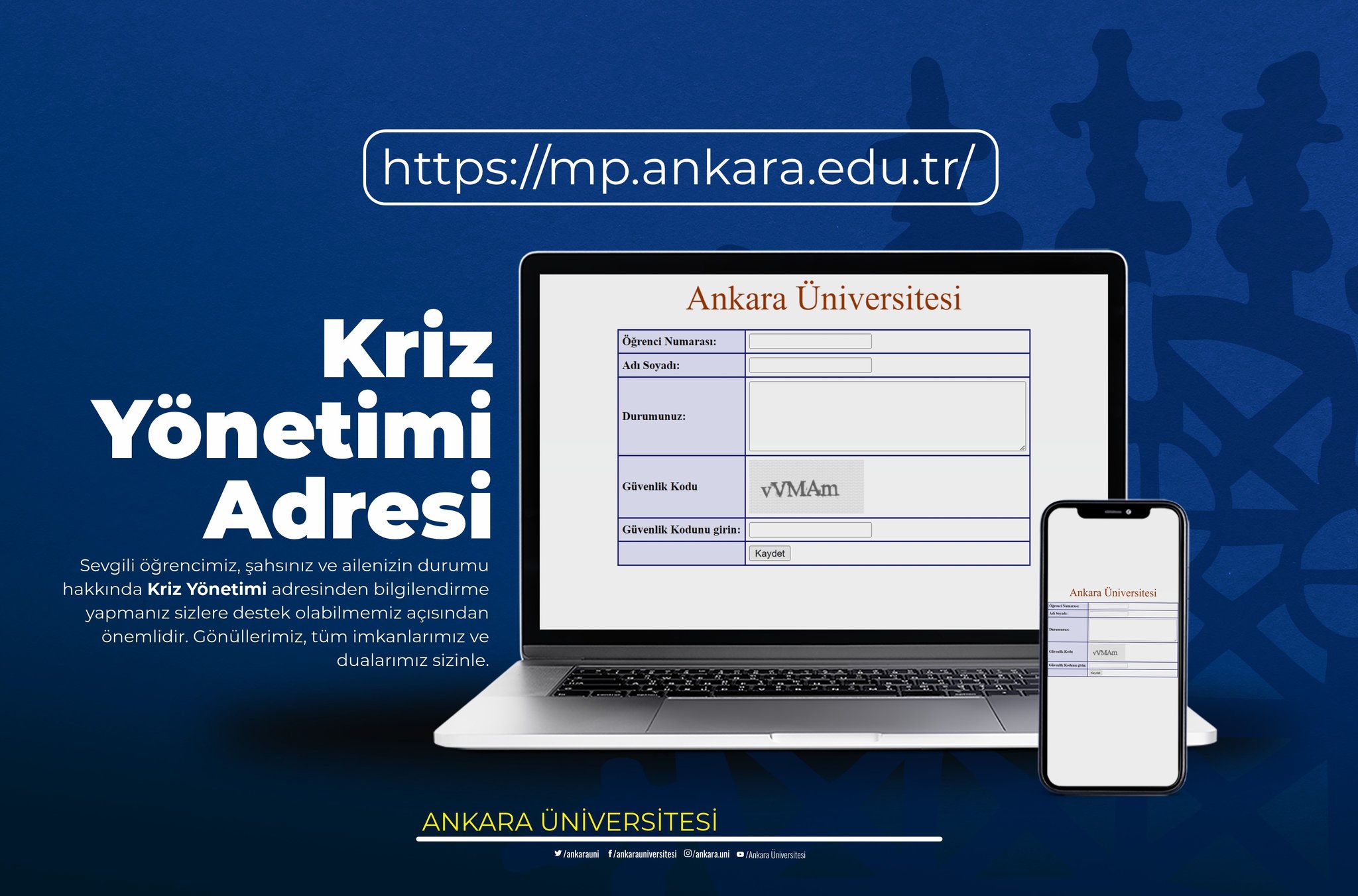 Sevgili öğrencimiz, şahsınız ve ailenizin durumu hakkında Kriz Yönetimi adresinden bilgilendirme yapmanız sizlere destek olabilmemiz açısından önemlidir. Gönüllerimiz, tüm imkanlarımız ve dualarımız sizinle.