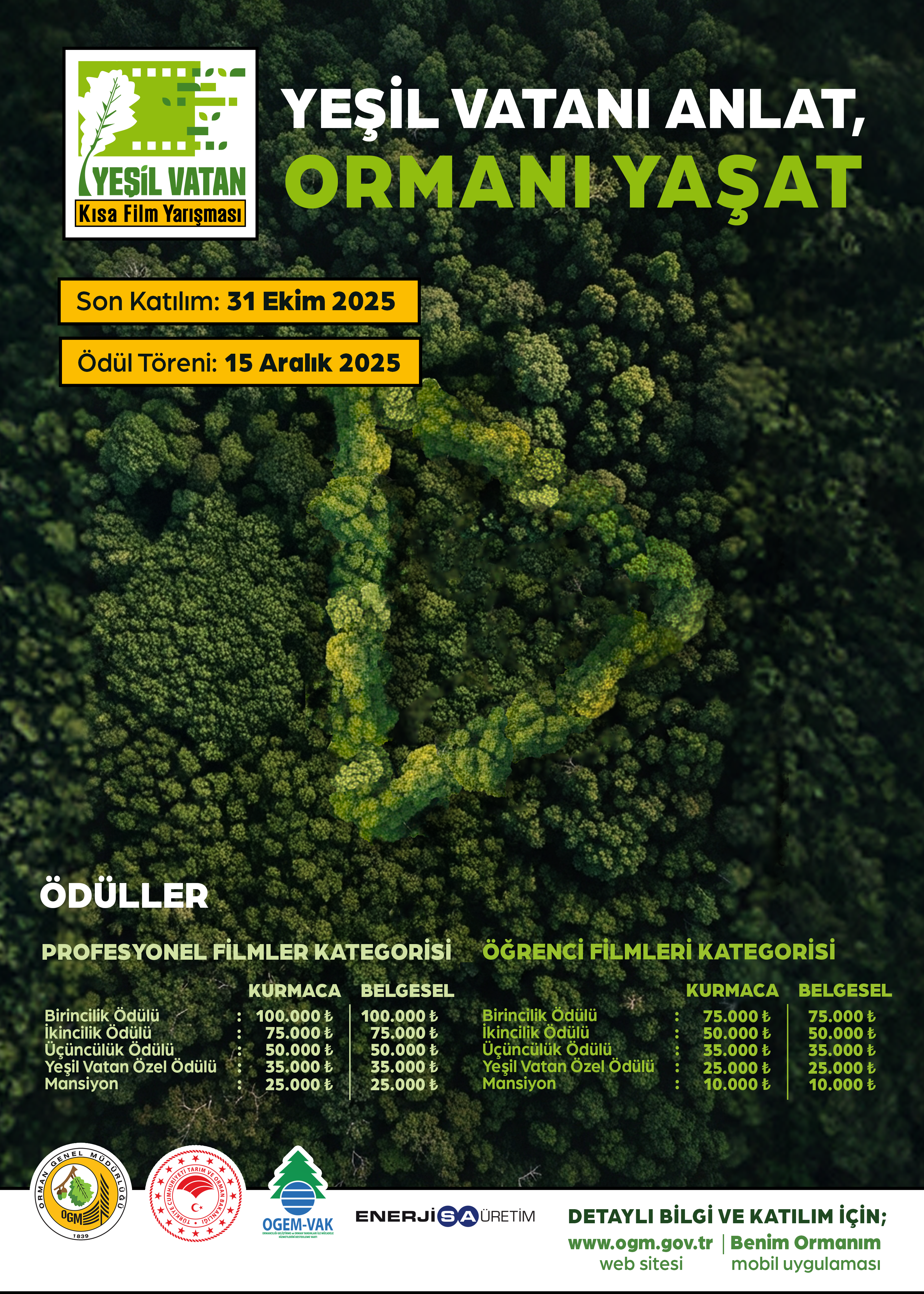 Orman Genel Müdürlüğü, OGEM-VAK ve Enerjisa Enerji Üretim A.Ş. iş birliği ile "Yeşil Vatan" Kısa Film Yarışması düzenlenmektedir. Vatanı yaşanabilir kılan en önemli unsurlardan biri olan ormanlarımız, gelecek nesillerin alacağı nefesin ve göreceği yeşilin teminatıdır. Bu sebeple ormanlar, yalnızca doğal varlıklarımız değil aynı zamanda milletimizin bağımsızlığı ve geleceği için de büyük önem taşımakta olup Yeşil Vatan kavramı ile ifade edilmektedir. Bu bağlamda, herkesin ormanla olan aidiyet duygusu, ormandan aldığı ve ormana kattıkları üzerinden Yeşil Vatan kavramına farklı bir bakış açısı geliştirmesi beklenmektedir. Yarışmaya tüm Yeşil Vatan sevdalılarının katılımı beklenmektedir. Yarışma ile ilgili detaylara aşağıdaki linkden ulaşılabilecektir.