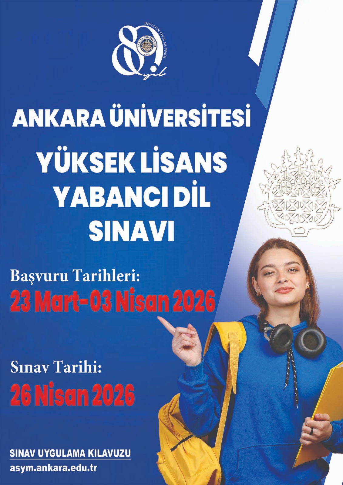 26 Nisan 2026 tarihinde Üniversitemiz Yabancı Diller Yüksekokulu ve Açık ve Uzaktan Eğitim Fakültesi Sınav Yönetim Merkezi ANKUZEF (ASYM) tarafından yapılacak olan Yüksek Lisans Yabancı Dil Sınavına (İngilizce, Almanca, Fransızca) Ankara Üniversitesi’nde yüksek lisans yapmak isteyen lisans mezunu adaylar ile öğrenciler başvurabilir. Bu sınavdan alınan puan Erasmus başvurusunda da kullanabilecektir.